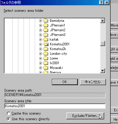 このシーナリーをインストールするためには、作者のReadme.txtの指示に従ってExcludeとFlattenの作業をしなければなりませんので、次に「Exclude/Flatten...」ボタンを押します。 |