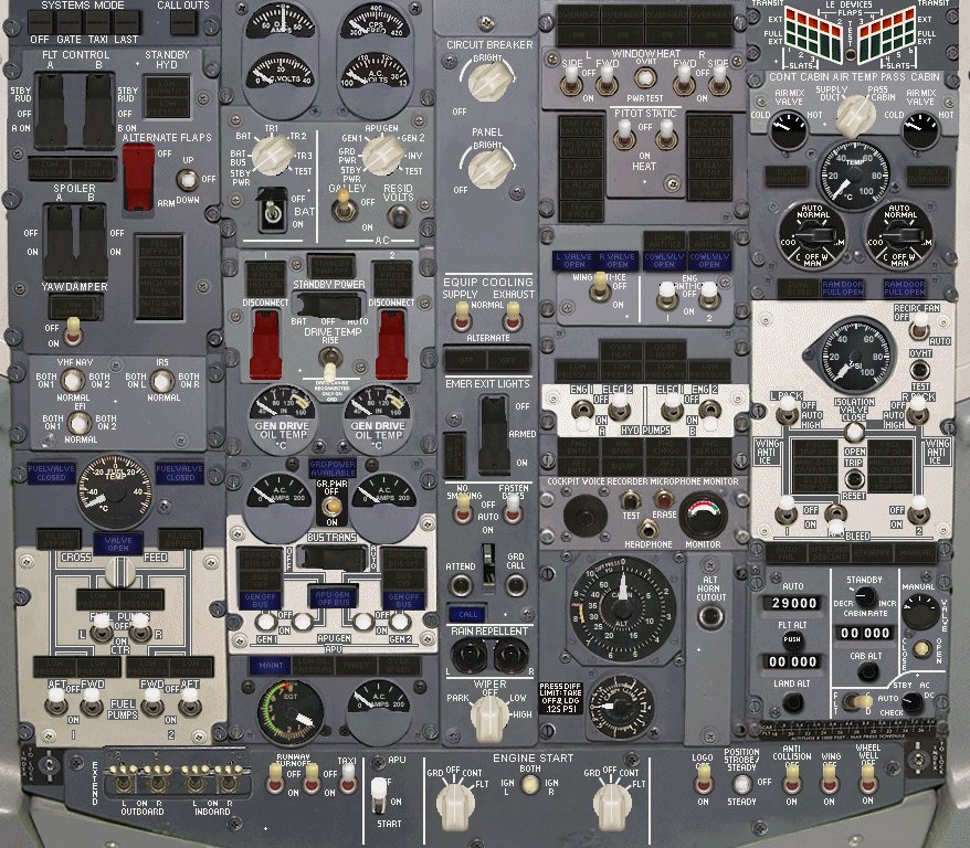 | エンジンスターのためには、パネルの様々な箇所のスイッチを操作しなければなりません。 そこで、この下の画像のようなパネルレイアウトを設定してください。 |