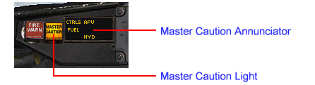 ここのMaster Caution Annunciatorにはオーバーヘッドパネル関係に何らかのトラブルその他問題が起こったとき視覚的な警報を与えるようになっています。(詳しくはメインパネルの説明のページをご覧ください)メッセージが現れましたら、左のMaster Caution Light