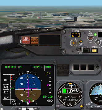| G/SをキャプチャーしますとFMAのG/Sの文字がホワイトからグリーンに変わります。 始めに少し揺れるかもしれませんが、少ししますと、ILSに乗り機体は安定して降下を続けます。 降下するに従って高度のコールがあります。 400ft以下になりましたらオートパイロットとオートスロットルのスイッチをオフにし、マニュアルで着地します。 (シングル又はデュアルオートパイロットモードでのアプローチ中、電波高度約27ftになりますとスロットルは自動的にアイドルまでリタードします。) |