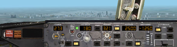| BIGに到達しましたら、速度を落とすためにIAS/MACHディスプレイの値を180ノットにします。 それからグリーンのアークを見ながら高度を2500ftにセットします。 210ノット以下になりましたら、フラップを下げ始めます。 |