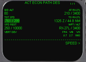 | T/Dに到達しますと、自動的に降下を開始します。 その時に、FMAの表示が変わります。 EHSIの方の表示は、右の画面のようにディスプレイの右側にVERTICAL DEVIATIONが表示されます。 DESモードキーを押しますと、ACT ECON PATH DESを見ることが出来、降下中の様子が分かります。 ここで、RX-27Lでの速度と高度は210ノット、3400ftであることが判ります。 その下のFPA,V/B,V/SにつきましてはFMCの解説のページで紹介しましたが、左から、フライトパスアングル、バーチカルベアリング、バーチカルスピードです。 |