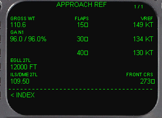 | 飛行中はINIT REFモードキーを押しますと、いつでもアプローチリファレンスページを見ることが出来ます。 右側のVREFをそれぞれラインセレクトしますと、EADIのスピードテープ上にその位置を示すことが出来ます。 フラップ15°で155ノット |