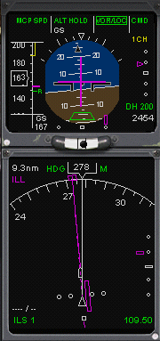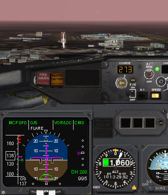 | 航空機はRX-27Lから滑走路の方位である273°の方向に旋回します。 EADIを注視しておりますとグライドスロープ指針およびローカライザー指針が動き始めますので、MCPのAPPボタンを押します。 すると、FMA上にホワイトのGSとVOR/LOCが表示されます。 右側の1CHの表示はオートパイロットが一つだけ働いていることを意味します。 続いてギアをおろします。 |