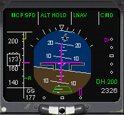 | G/SをキャプチャーしますとFMAのG/Sの文字がホワイトからグリーンに変わります。 始めに少し揺れるかもしれませんが、少ししますと、ILSに乗り機体は安定して降下を続けます。 降下するに従って高度のコールがあります。 1500ft以下に降下し、降下姿勢が安定しましたら自動着陸のためのオートパイロットのCMD