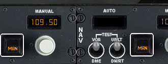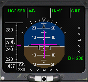 | NAV1、NAV2のAUTOを切り、MANにします。 するとEADI上にはグライドスロープ指針およびローカライザー指針が表示されます。 アプローチリファレンスページのVREFをラインセレクトしますとスピードテープ上にリファレンスのRが表示されます。 これを見ながら、速度を落としていき、同時にフラップを下げていきます。 |
