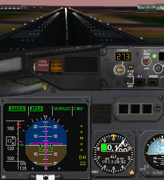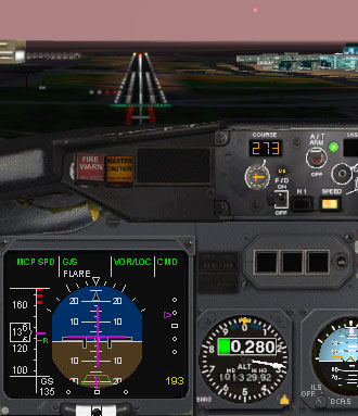 | 50ft以下になりますと自動的にフレアーが働き、同時にリタードが働きます。 FMAの表示にはRETARDとFLAREがグリーンで表示されます。 |