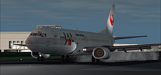 ![]() 前輪が接地しましたらリバーススラストレバーを手前に引きます。 セットしていたブレーキが自動的にかかり、スポイラーが立ち上がります。 60ノットになりましたら、リバーススラストレバーを戻し、フットブレーキで減速します。 きれいな夕日が迎えてくれました!