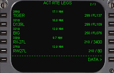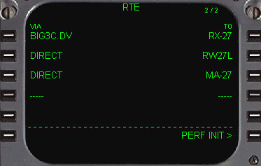 | NEXT PAGEキーを押して2ページを見ますと次の飛行ルートを見ることが出来ます。 BIG3Cルートが続いていますがこの区間はRX-27(滑走路に対する最終fixポイント)からR/W27Lにダイレクトに向かいます。 MA-27というのは我々が飛行したくないミスとアプローチポイントです。 それではこれからSIDを入力します。 LEGSキーを押してLEGSページに移動します。 |