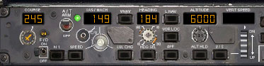 | MCPでF/DをON、A/TをARMにします。 IAS/MACHをV2の149ノットにセットします。 ヘディングを滑走路の方位186にセットします。 COURSEにはDVRの方位245をセットしています。 高度を制限高度の6000ftにセットします。 |