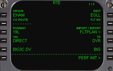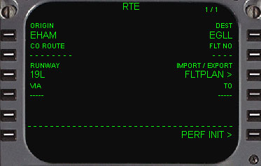 | RTEページになりますので、もう一度スクラッチパッドに出発空港であるEHAMを入れ1L(ORIGIN)をラインセレクトします。 同様に目的地の空港であるEGLLをスクラッチパッドに入れて1R(DEST)をラインセレクトします。 |