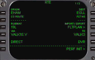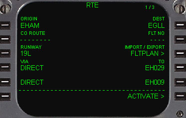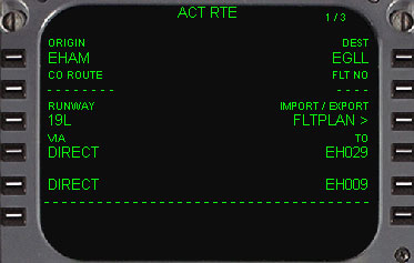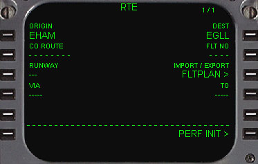| RTEページになりますので、もう一度スクラッチパッドに出発空港であるEHAMを入れ1L(ORIGIN)をラインセレクトします。 同様に目的地の空港であるEGLLをスクラッチパッドに入れて1R(DEST)をラインセレクトします。 |