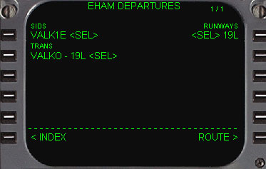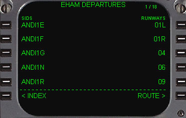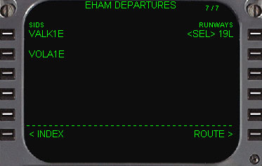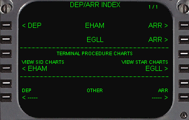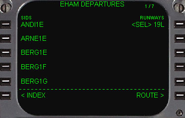 | 次に行うことは、出発空港の滑走路の選択と出発経路の選択をします。 そして到着空港も同様に滑走路の選択、到着経路の選択をします。 DEP ARRモードキーを押します。 続いてEHAMのDEPARTUREのデータのあるページに移動するために、1L(DEP)をラインセレクトします。 |