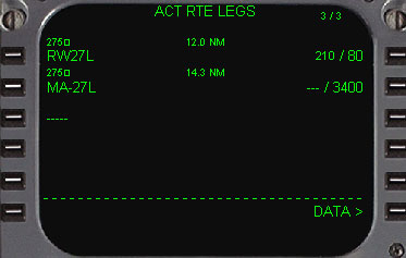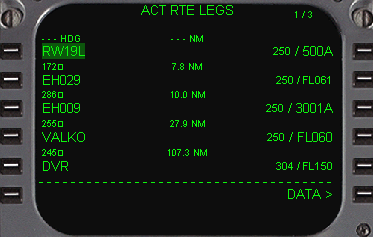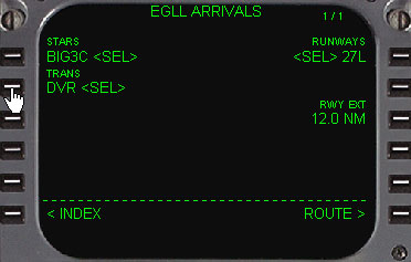 | RUNWAY27Lを選択し、STARSはBIG3Cアライバルを選択します。するとトランジッションが表示されますので、DVRをラインセレクトします。 3RにRWY EXT 12.0NMと表示されているのは、アプローチを安定させるための着陸滑走路の延長線上のポイントです。お望みなら少し延長又は短くする事もできますがここはそのままにしておきます。 次に、6R(ROUTE)をラインセレクトし、ルートページに戻ります。 |