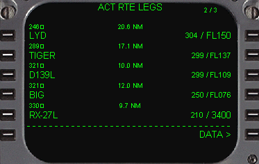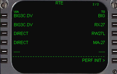 | NEXT PAGEキーを押して2ページを見ますと次の飛行ルートを見ることが出来ます。 これだけでフライトコースの作成は完了しています。 次に6R(PERF INIT)をラインセレクトして、PERF INITページにアクセスします。 |