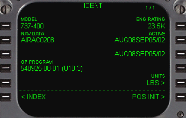 | FMCの起動はキーボードのTabキーを押すか、パネル中央下のクリックスポットを押します。 FMCを起動しますとIDENTページが開きますので、6RのPOS INITを選択します。 一番始めに行うことは、出発地と目的地の空港を入力することです。 文字の入力方法は、マウスでキーボードをクリックするか、パソコンのキーボードのScroll Lockキーを押して、パソコンのキーボードから直接入力します。後の方法では入力終了後必ず再びScroll Lockキーを押して解除することを忘れないようにしなければなりません。 |
