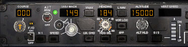 | MCPでF/DをON、A/TをARMにします。 IAS/MACHをV2の149ノットにセットします。 ヘディングを滑走路の方位、184にセットします。 高度を巡航高度の15000ftにセットします。 |