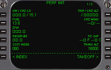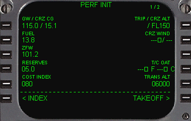 | 各ボックスプロンプトに必要な値を入力していきます。 このDF737のFMCでは1LのGW(Gross Weight)は自動的に算出する機能があります。実機ではもちろん無いのですがとても便利な機能であります。 1Lをクリックするだけで値が自動的に表示されます。 |