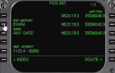 | POS INITページが開きましたら、スクラッチパッドにスキポール空港のICAOコードであるEHAMを入れ、2Lをラインセレクトします。 これは一番始めのポジションとしての入力です。(今はGATEは無視します) |