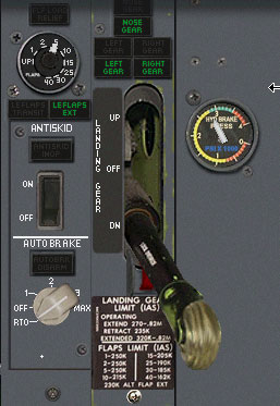 | ギアパネルを開き、オートブレーキをRTOにセットします。これにより、離陸を断念したときにスラストレバーをアイドルにすると自動的にオートブレーキがかかります。 フラップを5°にセットします。するとコパイロットがコールアウトします。 ランディングライトを点灯します。 |