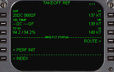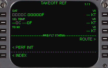 | 次にスクラッチパッドに5000ポンドの予備燃料の値を入力し、4Lをラインセレクトします。 巡航高度を入力します。このようなショートフライトでは15000ftになりますのでスクラッチパッドに15000と入力し、1Rをラインセレクトします。 ヨーロッパでは、制限高度はアメリカの18000ftに換わり、6000ftが採用されていますので、スクラッチパッドに6000と入力して5Rをラインセレクトします。 ここで、EXECキーが点灯していますので、押します。 6R(TAKE OFF)をラインセレクトしてTAKE OFFページに移動します。 |