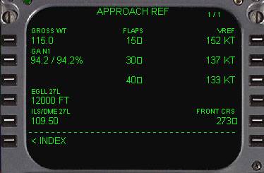 15,30,40 ・ FMCによって計算されたフラップセッティングのランディングVrefを表示します。速度は表示されているGROSS