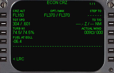 | [1L] CRUISE ALTITUDE LINE ・ 計画された巡航高度を入力又は表示します。 [2L] TARGET SPEED LINE ・ マニュアル入力は別として、どのCRZモードでもコンピューター計算された値がエアスピードとマックで表示されます。 [3L] TURBULENCE N1 LINE ・ 乱気流に遭遇進入する際のN1%の基準値を表示します。 [4L] FUEL AT LINE ・ 目的地での予測燃料残量を表示します。 [6L] CRUISE PAGE PROMPT ・ LRC(Long-range-cruise)ページに変わります。 |