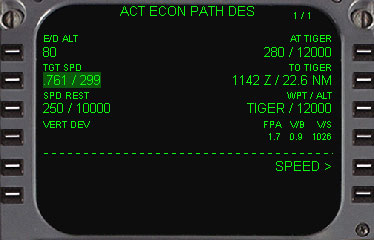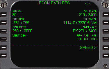 SPD DESモードのための計算されたターゲットマッハとエアスピードの値を表示します。 [5L] ECONOMY PROMPT ・ マニュアルDESページで表示されます。 |