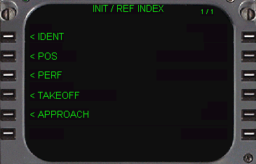 | [1L] IDENTIFICATION PROMPT ・ ラインセレクトでIDENTページにアクセスします。 [2L] POSITION INITIALIZATION PROMPT ・ ラインセレクトでPOS INITページにアクセスします。 [3L] PERFORMANCE INITIALIZATION PROMPT ・ ラインセレクトでPERF INITページにアクセスします。 [4L] TAKEOFF REFERENCE PROMPT ・ ラインセレクトでTAKEOFF REFページにアクセスします。 [5L] APPROACH REFERENCE PROMPT ・ ラインセレクトでAPPROACH REFページにアクセスします。 |