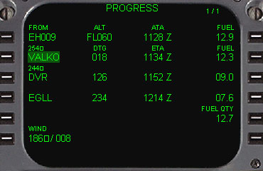 | [1L] FROM LINE ・ 現在航空機が飛んでいる直ぐ前のウェイポイントの名前を表示し、そのウェイポイントでの燃料の残量、ATA(Actual time of arrival:到着時刻)、それと高度を表示します。 [2L] ACTIVE WAYPOINT LINE ・ アクティブウェイポイント(現在向かっているウェイポイント)の名前を表示します。 [3L] NEXT WAYPOINT LINE ・ アクティブウェイポイントの次のウェイポイント名を表示します。 [4L] DESTINATION LINE ・ 目的地の空港の名前を表示し、現在の位置からのフライトプランのDTG(残距離)を表示します。 [6L] WINDS ・ FMCが受けている現在の風の情報(風向/風速)。 |