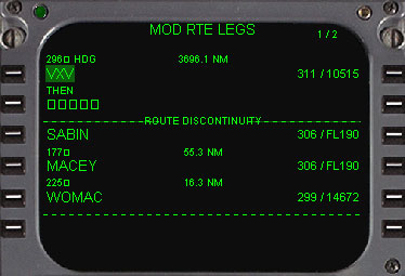 | ・ 入力されたルートは常にリンクされたレグの連続したパスの形になっていなければなりません。 ・ もし不連続が起こったら不連続のウェイポイント間にボックスプロンプトが表示されます。ルート不連続はEXECが点灯する前に解消されなければなりません。 ・ 不連続を解消するためには、ボックスプロンプトの下のウェイポイントのラインセレクトキーを押します。 上の場合ですと、SABINのラインセレクトキー(3L)を押すとスクラッチパッドに“SABIN”と入力されます。 それから不連続になっているボックスプロンプトのラインセレクトキー(2L)を押しますと不連続は解消されます。 |