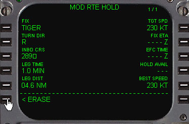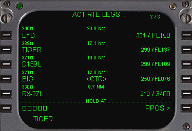 | ・ HOLDモードキーを押しますと新しいHOLDが受け付けられ、HOLDプロンプトが表示されます。(6L) もう一度HOLDモードキーを押しますとキャンセルされます。 ・ プロンプトにホールドウェイポイントを入力します。この入力方法は、うえの説明と同様希望するウェイポイント(ここの例はTIGER)をラインセレクトしますとスクラッチパッドに表示されます。 次に6Lをラインセレクトしますと、そこ(TIGER)がホールディング地点となります。そして下の画像のように表示されます。 |