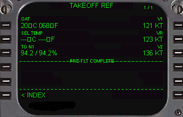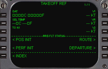LINE ・ 現在のテイクオフOAT(外気温度 +/-XX ℃又は +/-XX ゜F) ・ ゜Fでの気温の入力によって℃の気温も表示されます。 [2L] SELECTED TEMPERATURE LINE ・ レデューストスラストテイクオフを行うときに仮定温度をここに入力します。 ・ 入力は℃(+/-XX) 又は゜F( +/-XX)のどちらでも構いません。 ・ ゜Fが使用されたら℃も表示されます。 [3L] TAKEOFF N1 LINE ・ FMCの計算したテイクオフのためのN1を表示します。(オートスロットルで使用されます) ・ [2L]のSEL TEMPの入力によってレデューストN1値が出ますが、データラインはRED-TO-N1の表示に変わります。 ・ IASとMachナンバーのどちらでも入力できます。 [6L] INDEX PROMPT ・ ラインセレクトしますとINIT-REF INDEXページに変わります。 |