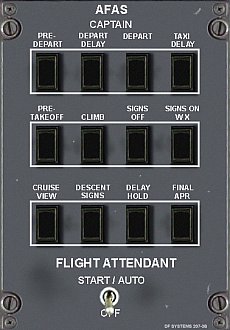 AFASは実際の航空機には備わっていません。AFASはキャプテンとフライトアテンダントの乗客へのアナウンスをあらかじめ録音したものを再生することが出来ます。