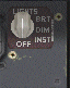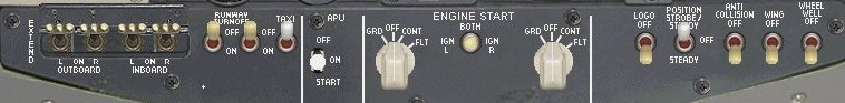 外部照明スイッチ類です。オーバーヘッドパネルの一番下にあります。 シミュレーションに関係するのは、以下の3つです。 一番左: ランディングライト