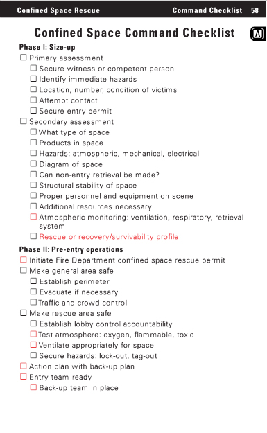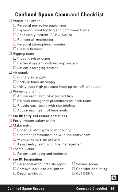Confined Space Command Checklist Proper equipment Personal protective equipment Explosion proof lighting and communications Respiratory system (SCBA, SABA) Remote air monitoring Personal atmospheric monitor Class 3 harness Rigging team Tripod, davit or crane Retrieval system with back-up system Patient packaging devices Air supply Primary air supply Back-up team air supply Utility truck high pressure hook-up for refill of bottles Pre-entry briefing Advise each team of expected task Discuss emergency procedures for each team Provide each team with site briefing Advise each team of time limits Phase III: Entry and rescue operations Entry system safety check Make entry Continual atmospheric monitoring Constant communication with the entry team Monitor ventilation system Assist entry team with line management Locate victim Patient packaging and extrication Phase IV: Termination Personnel accountability report Secure scene Remove tools and equipment Consider debriefing Decontamination Call OSHA Confined Space Rescue Command Checklist 59 |