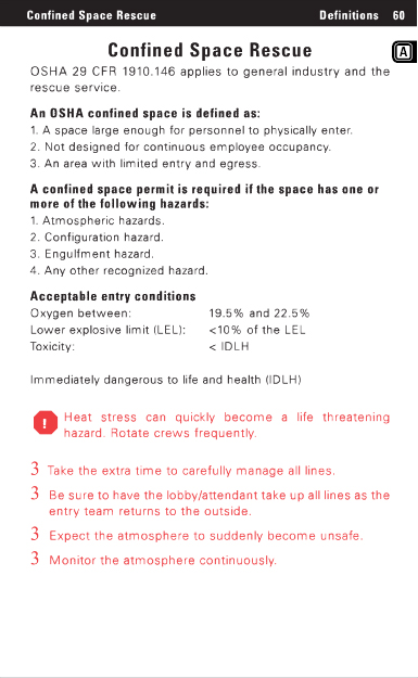 Confined Space Rescue Definitions 60 Confined Space Rescue OSHA 29 CFR 1910.146 applies to general industry and the rescue service. An OSHA confined space is defined as: 1. A space large enough for personnel to physically enter. 2. Not designed for continuous employee occupancy. 3. An area with limited entry and egress. A confined space permit is required if the space has one or more of the following hazards: 1. Atmospheric hazards. 2. Configuration hazard. 3. Engulfment hazard. 4. Any other recognized hazard. Acceptable entry conditions Oxygen between: 19.5% and 22.5% Lower explosive limit (LEL): <10% of the LEL Toxicity: < IDLH Immediately dangerous to life and health (IDLH) Heat stress can quickly become a life threatening hazard. Rotate crews frequently. 3 Take the extra time to carefully manage all lines. 3 Be sure to have the lobby/attendant take up all lines as the entry team returns to the outside. 3 Expect the atmosphere to suddenly become unsafe. 3 Monitor the atmosphere continuously. |