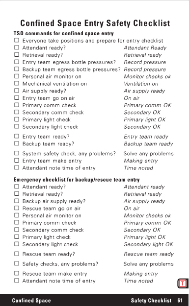 Confined Space Entry Safety Checklist TSO commands for confined space entry Everyone take positions and prepare for entry checklist Attendant ready? Attendant Ready Retrieval ready? Retrieval ready Entry team egress bottle pressures? Record pressure Backup team egress bottle pressures? Record pressure Personal air monitor on Monitor checks ok Mechanical ventilation on Ventilation on Air supply ready? Air supply ready Entry team go on air On air Primary comm check Primary comm OK Secondary comm check Secondary OK Primary light check Primary light OK Secondary light check Secondary OK Entry team ready? Entry team ready Backup team ready? Backup team ready System safety check, any problems? Solve any problems Entry team make entry Making entry Attendant note time of entry Time noted Emergency checklist for backup/rescue team entry Attendant ready? @Attendant ready Retrieval ready? @Retrieval ready Backup air supply ready?@ Air supply ready Rescue team go on air. @ On air Personal air monitor on. Monitor checks ok Primary comm check. Primary comm OK Secondary comm check. Secondary OK Primary light check. Primary light OK Secondary light check. Secondary light OK Rescue team ready? Rescue team ready Safety checks, any problems? Solve any problems Rescue team make entry. Making entry Attendant note time of entry. Time noted Confined Space Safety Checklist 61 |