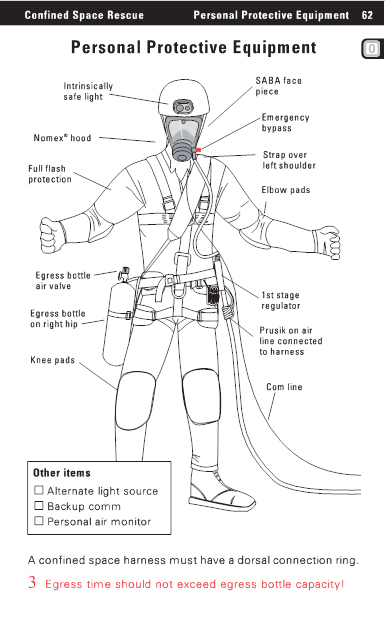 Confined Space Rescue Personal Protective Equipment 62 Personal Protective Equipment Intrinsically safe light SABA face piece Nomex R hood Full flash protection Emergency bypass Strap over left shoulder Elbow pads Egress bottle air valve Egress bottle on right hip Knee pads 1st stage regulator Prusik on air line connected to harness Com line Other items Alternate light source Backup comm Personal air monitor A confined space harness must have a dorsal connection ring. 3 Egress time should not exceed egress bottle capacity! |