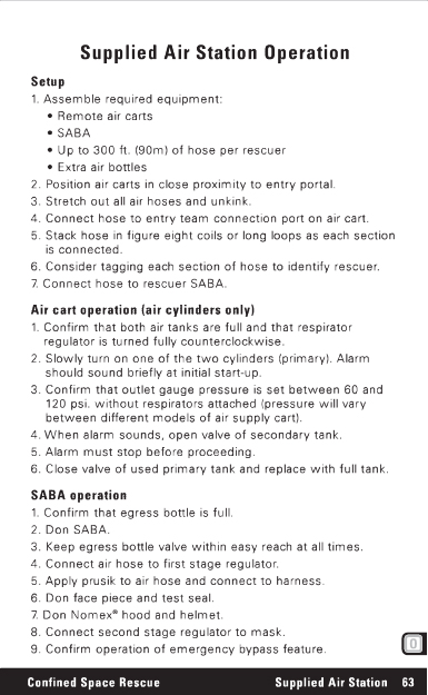 Supplied Air Station Operation Setup 1. Assemble required equipment: _ Remote air carts _ SABA _ Up to 300 ft. (90m) of hose per rescuer _ Extra air bottles 2. Position air carts in close proximity to entry portal. 3. Stretch out all air hoses and unkink. 4. Connect hose to entry team connection port on air cart. 5. Stack hose in figure eight coils or long loops as each section is connected. 6. Consider tagging each section of hose to identify rescuer. 7. Connect hose to rescuer SABA. Air cart operation (air cylinders only) 1. Confirm that both air tanks are full and that respirator regulator is turned fully counterclockwise. 2. Slowly turn on one of the two cylinders (primary). Alarm should sound briefly at initial start-up. 3. Confirm that outlet gauge pressure is set between 60 and 120 psi. without respirators attached (pressure will vary between different models of air supply cart). 4. When alarm sounds, open valve of secondary tank. 5. Alarm must stop before proceeding. 6. Close valve of used primary tank and replace with full tank. SABA operation 1. Confirm that egress bottle is full. 2. Don SABA. 3. Keep egress bottle valve within easy reach at all times. 4. Connect air hose to first stage regulator. 5. Apply prusik to air hose and connect to harness. 6. Don face piece and test seal. 7. Don Nomex R hood and helmet. 8. Connect second stage regulator to mask. 9. Confirm operation of emergency bypass feature. Confined Space Rescue Supplied Air Station 63 |