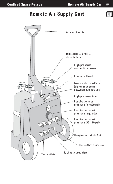Confined Space Rescue Remote Air Supply Cart 64 Remote Air Supply Cart Air cart handle 4500, 3000 or 2216 psi air cylinders High pressure connection hoses Pressure bleed Low air alarm whistle(alarm sounds at between 500-600 psi) High pressure inlet Respirator inlet pressure (0-4500 psi) Respirator outlet pressure regulator Respirator outlet pressure (60-120 psi) Respirator outlets 1-4 Tool outlet pressure Tool outlets Tool outlet regulator |