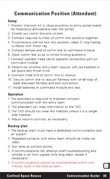 Communication Position (Attendant) Setup 1. Position intercom kit in close proximity to entry portal (watch for hazardous atmosphere near the portal). 2. Stretch out comm line and un-kink. 3. Connect required number of comm line sections together. 4. If connectors will not lock into position, clean O ring mating surfaces with moist rag. 5. Connect female end of comm line to command module. 6. Stack comm line so as to inhibit kinking problems. 7. Connect operator head set to operator connection port on command module. 8. Determine whether entry team rescuer will use headset or ear piece and throat mike. 9. Connect male end of comm line to rescuer. 10. Secure comm line to rescuer harness with small loop of slack between harness and end connection. 11. Install batteries in command module and test. Operation 1. The attendant is required to maintain constant communication with the entry team. 2. The attendant can relay information to the TSO. 3. The TSO should not wear the headset unless it is a single side headset. 4. Adjust volume controls, as necessary. Backup plan 1. The backup team must have a dedicated communication and air system. 2. Repeated contacts with entry team should be made via radio. 3. Test radio at junction points. 4. If communications fail, attempt brief troubleshooting and whistle or air horn signals (one long blast, repeat if necessary). 5. If communications cannot be re-established within one minute, send in the backup team. Confined Space Rescue Communication Sector 65 |