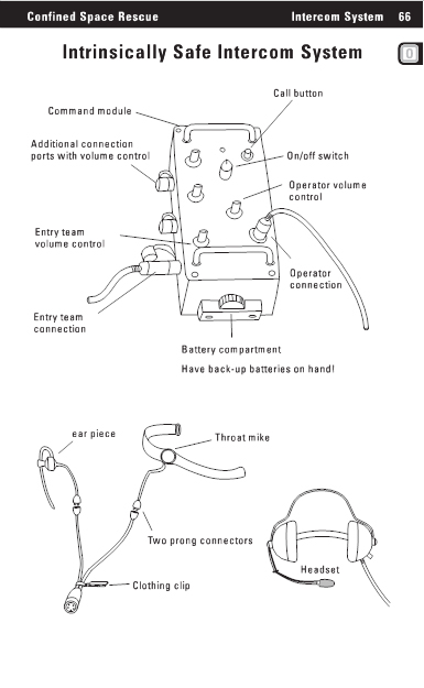 Confined Space Rescue Intercom System 66 Intrinsically Safe Intercom System Call button Command module Additional connection ports with volume control On/off switch Operator volume control Entry team volume control Operator connection Entry team connection Battery compartment Have back-up batteries on hand! ear piece Throat mike Two prong connectors Clothing clip Headset |