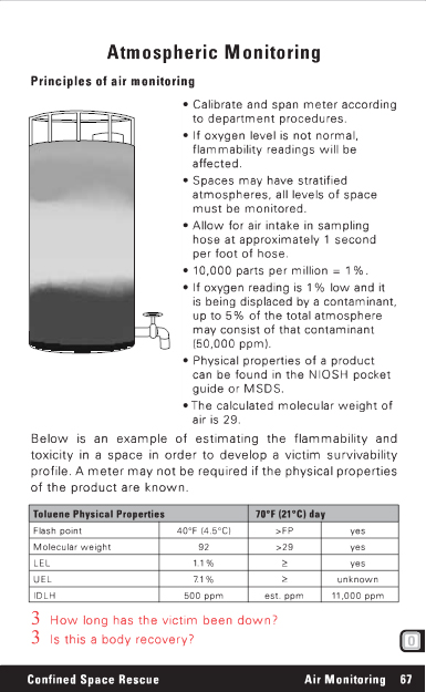 Atmospheric Monitoring Principles of air monitoring _ Calibrate and span meter according to department procedures. _ If oxygen level is not normal, flammability readings will be affected. _ Spaces may have stratified atmospheres, all levels of space must be monitored. _ Allow for air intake in sampling hose at approximately 1 second per foot of hose. _ 10,000 parts per million = 1%. _ If oxygen reading is 1% low and it is being displaced by a contaminant, up to 5% of the total atmosphere may consist of that contaminant (50,000 ppm). _ Physical properties of a product can be found in the NIOSH pocket guide or MSDS. _ The calculated molecular weight of air is 29. Below is an example of estimating the flammability and toxicity in a space in order to develop a victim survivability profile. A meter may not be required if the physical properties of the product are known. Toluene Physical Properties 70F (21C) day Flash point 40F (4.5C) >FP yes Molecular weight 92 >29 yes LEL 1.1% 3 yes UEL 7.1% 3 unknown IDLH 500 ppm est. ppm 11,000 ppm 3 How long has the victim been down? 3 Is this a body recovery? Confined Space Rescue Air Monitoring 67 |