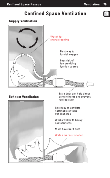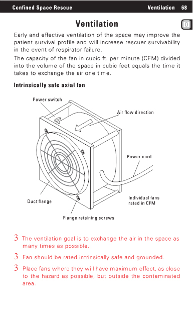 Confined Space Rescue Ventilation68 Ventilation Early and effective ventilation of the space may improve the patient survival profile and will increase rescuer survivability in the event of respirator failure. The capacity of the fan in cubic ft. per minute (CFM) divided into the volume of the space in cubic feet equals the time it takes to exchange the air one time. Intrinsically safe axial fan Power switch Air flow direction Power cord Duct flange Individual fans rated in CFM Flange retaining screws 3 The ventilation goal is to exchange the air in the space as many times as possible. 3 Fan should be rated intrinsically safe and grounded. 3 Place fans where they will have maximum effect, as close to the hazard as possible, but outside the contaminated area. |
