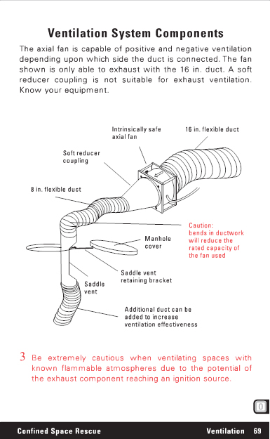 Ventilation System Components The axial fan is capable of positive and negative ventilation depending upon which side the duct is connected. The fan shown is only able to exhaust with the 16 in. duct. A soft reducer coupling is not suitable for exhaust ventilation. Know your equipment. Intrinsically safe axial fan 16 in. flexible duct Soft reducer coupling 8 in. flexible duct Manhole cover Caution: bends in ductwork will reduce the rated capacity of the fan used Saddle vent Saddle vent retaining bracket Additional duct can be added to increase ventilation effectiveness 3 Be extremely cautious when ventilating spaces with known flammable atmospheres due to the potential of the exhaust component reaching an ignition source. Confined Space Rescue Ventilation 69 |