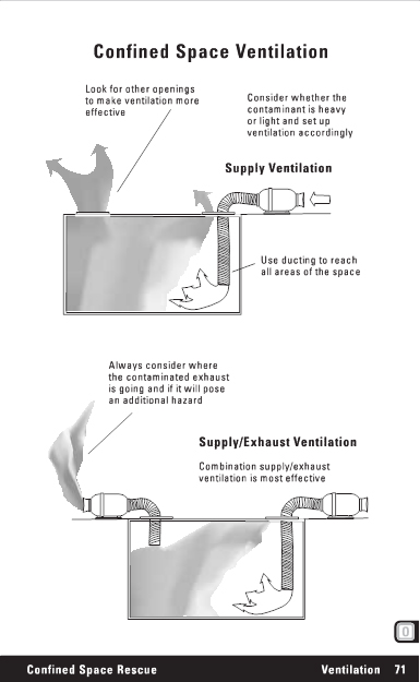 Confined Space Rescue Ventilation 70 Confined Space Ventilation Supply Ventilation Watch for short circuiting Best way to furnish oxygen Less risk of fan providing ignition source Exhaust Ventilation Extra duct can help direct contaminants and prevent recirculation Best way to ventilate flammable or toxic atmospheres Works well with heavy contaminants Must have hard duct Watch for recirculation |