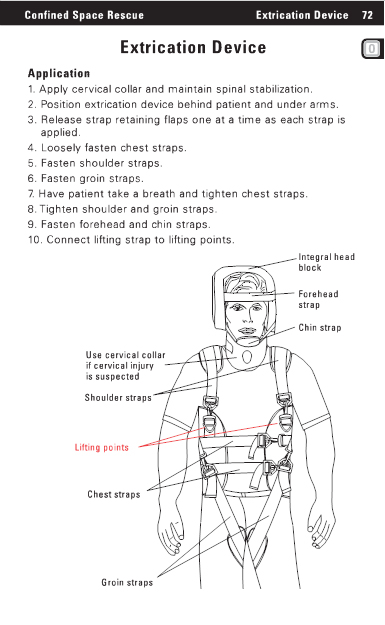 Confined Space Rescue Extrication Device 72 Extrication Device Application 1. Apply cervical collar and maintain spinal stabilization. 2. Position extrication device behind patient and under arms. 3. Release strap retaining flaps one at a time as each strap is applied. 4. Loosely fasten chest straps. 5. Fasten shoulder straps. 6. Fasten groin straps. 7. Have patient take a breath and tighten chest straps. 8. Tighten shoulder and groin straps. 9. Fasten forehead and chin straps. 10. Connect lifting strap to lifting points. Integral head block Forehead strap Chin strap Use cervical collar if cervical injury is suspected Shoulder straps Lifting points Chest straps Groin straps |