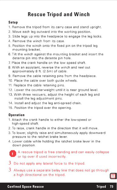 Rescue Tripod and Winch Setup 1. Remove the tripod from its carry case and stand upright. 2. Move each leg outward into the working position. 3. Slide legs up into the headpiece to engage the leg locks. 4. Remove the winch from its case. 5. Position the winch onto the fixed pin on the tripod leg mounting bracket. 6. Tilt the winch against the mounting bracket and insert the detente pin into the detente pin hole. 7. Place the crank handle on the low speed shaft. 8. With an assistant, reverse the winch and reel out approximately 8 ft. (2.5m) of cable. 9. Remove the cable retaining pins from the headpiece. 10. Place the cable over both guide wheels. 11. Replace the cable retaining pins. 12. Lower the counterweight until it is near ground level. 13. With three rescuers, adjust the height of each leg and install the leg adjustment pins. 14. Install and adjust the leg anti-spread chain. 15. Position the tripod over the opening. Operation 1. Attach the crank handle to either the low-speed or high-speed shaft. 2. To raise, crank handle in the direction that it will move. 3. To lower, slightly raise and simultaneously apply downward pressure to the ratchet brake lever. 4. Lower cable while holding the ratchet brake lever in the down position. A rescue tripod is free standing and can easily collapse or tip over if used incorrectly. 3 Do not apply any lateral force to the tripod. 3 Always use a separate belay line that does not go through a high directional on the tripod. Confined Space Rescue Tripod 73 |