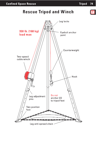 Confined Space Rescue Tripod 74 Rescue Tripod and Winch Leg locks 350 lb. (160 kg) load max Eyebolt anchor point Counterweight Two-speed cable winch Hook Leg adjustment pins Two position foot Do not anchor CD to tripod feetLeg anti-spread chain |